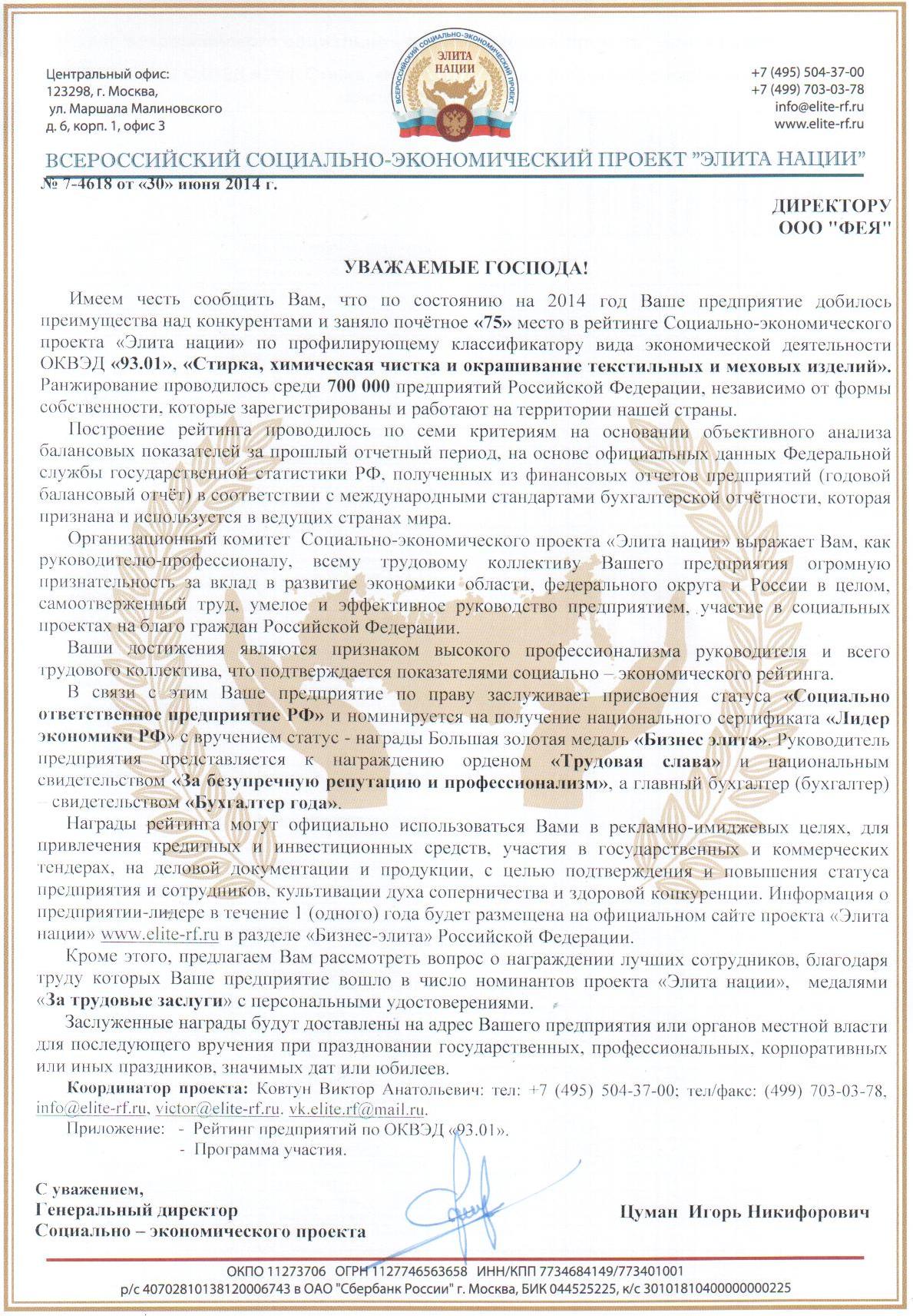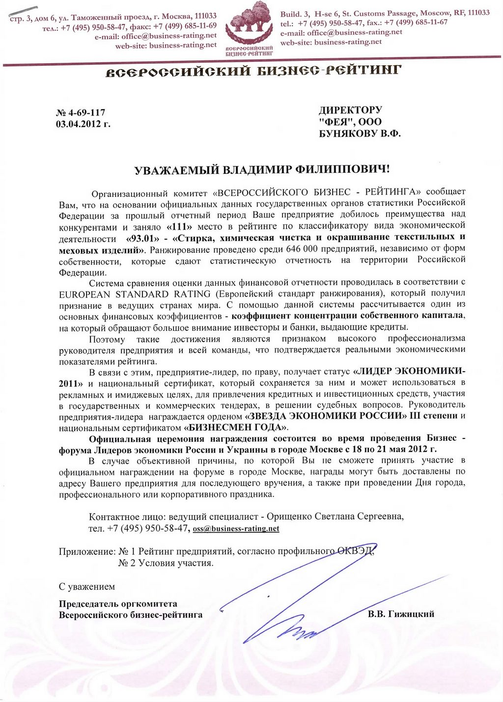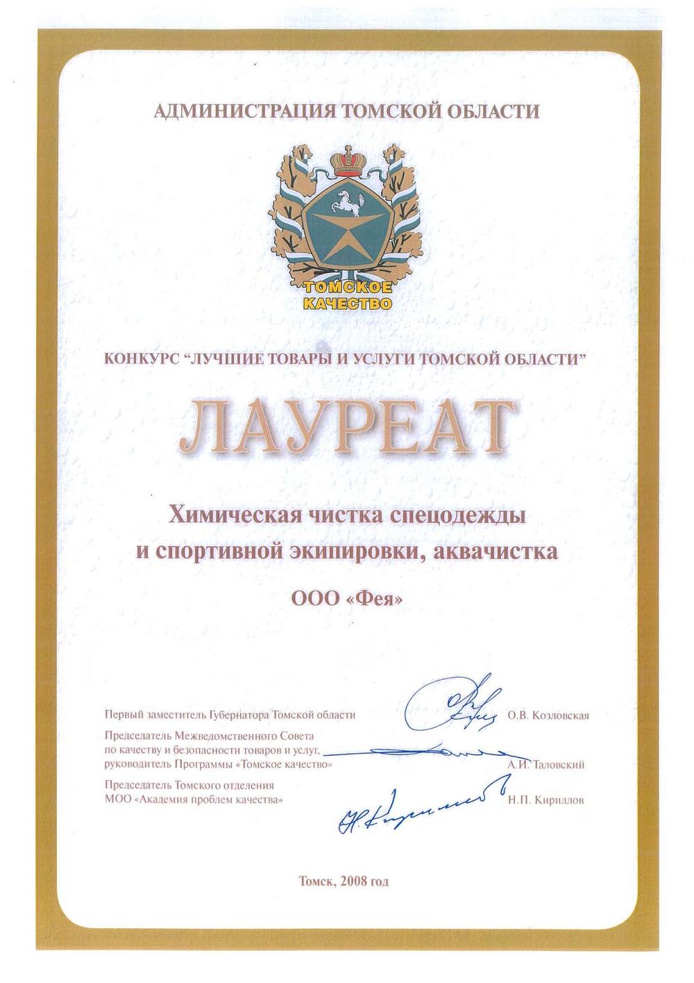 Для нас это не просто слова. В профессиональной химчистке-прачечной «Фея» действительно дорожат своими клиентами, своим добрым именем и отличной репутацией. Специалисты гарантируют высокое качество предоставляемых услуг, независимо от типа и вида изделия, степени его износа и загрязнения. Лучшее подтверждение этому – оценки экспертов и награды в профессиональных конкурсах.